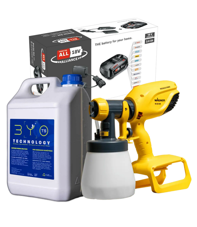 Mit dem innovativen Akku-Sprühsystem gelingt ein gleichmäßiger Auftrag in nur einem Arbeitsgang. Dank modernster HVLP-Technologie wird die Flüssigkeit besonders fein zerstäubt, sodass ein perfektes, deckendes Ergebnis entsteht. Kabellos, schnell und flexibel – das System ermöglicht eine unbegrenzte Bewegungsfreiheit, da es unabhängig von einem Stromanschluss arbeitet.