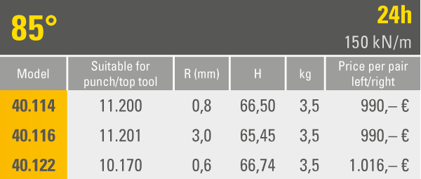 Product advantages▶ Easy and quick bending of boxes▶ Easy removal of the finished profile ▶ Compatible with punches/top tools (see table) ▶ Individual production possible |